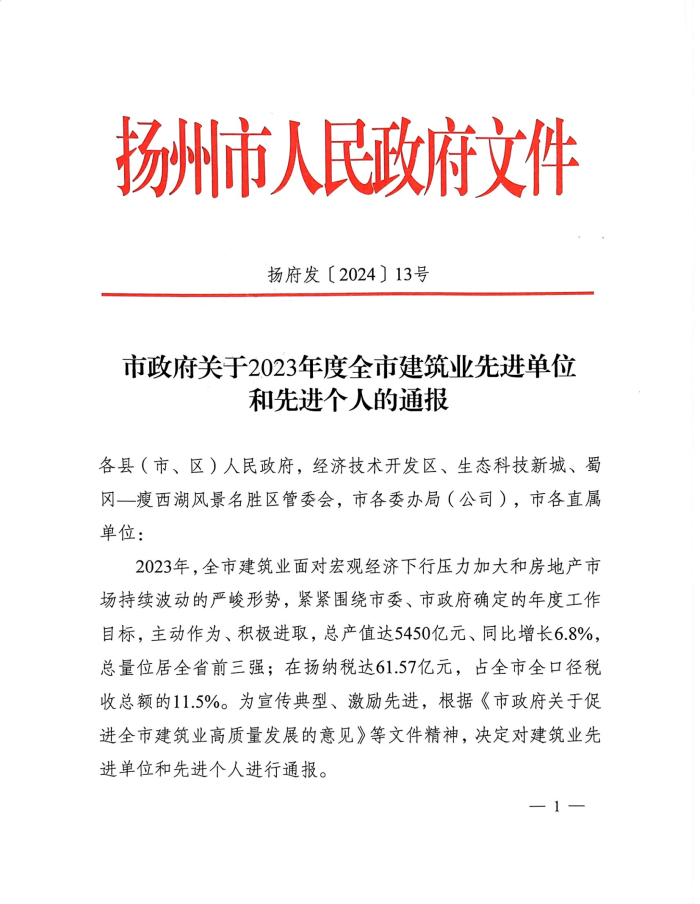 | 喜报!我司荣获2023年度“扬州市建筑业先进企业”称号 |