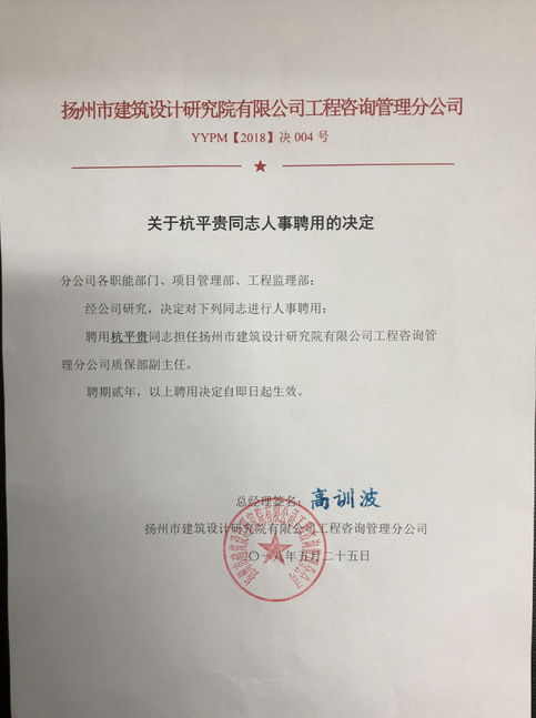 关于杭平贵同志人事聘用的决定