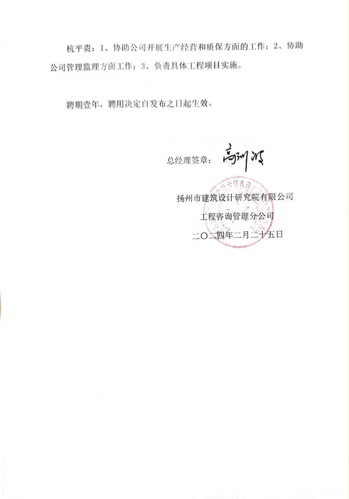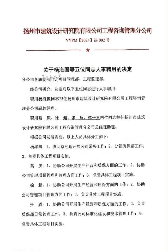聘用 杨海国 同志担任扬州市建筑设计研究院有限公司工程咨询管理分公司副总经理。