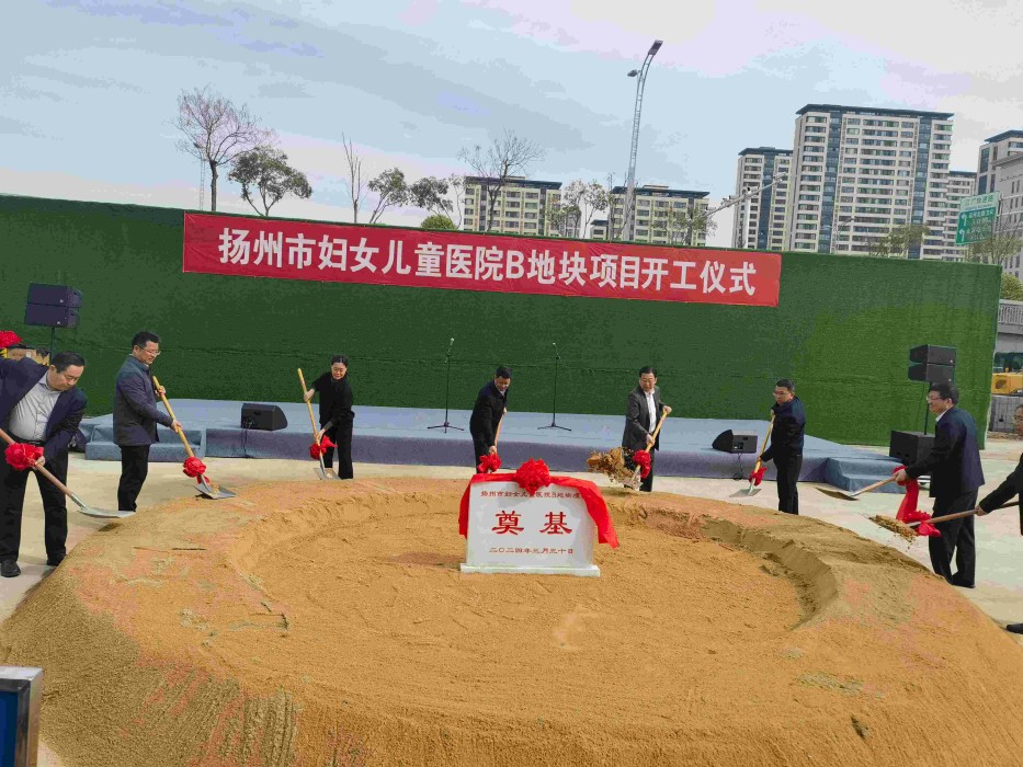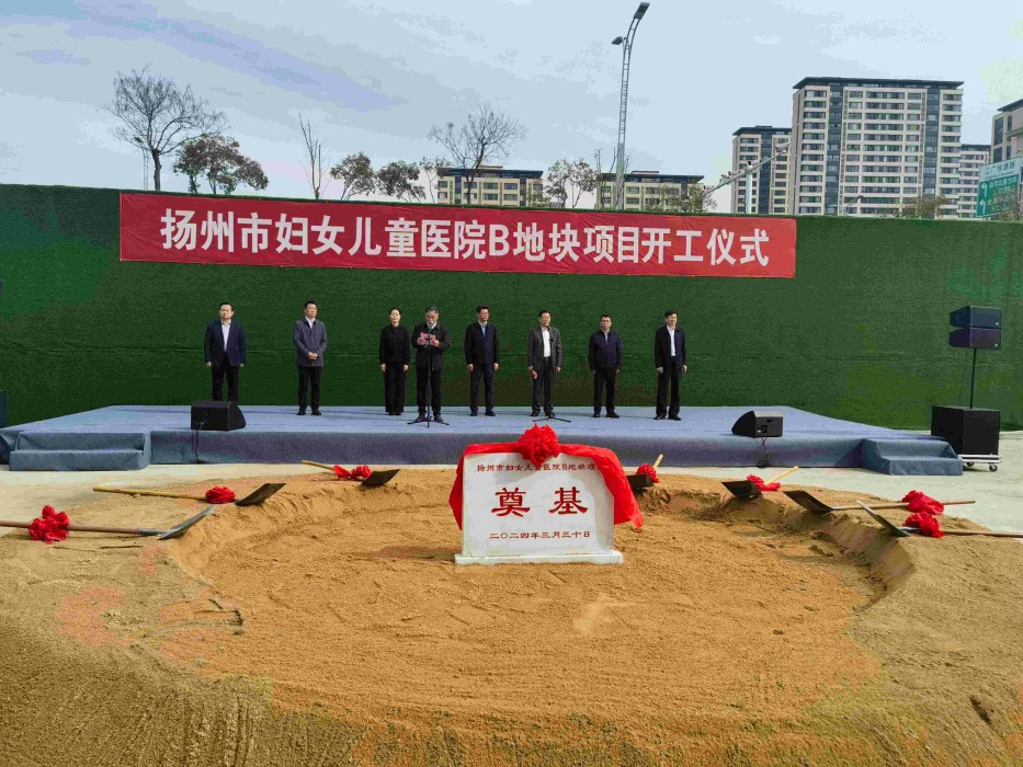 2024年3月30日扬州市妇女儿童医院B地块举行开工仪式,开工仪式由市领导潘学元主持,市委书记王进健发表致辞,代表市委市政府向扬州市妇女儿童医院B地块顺利开工表示热烈祝贺,副市长刘流、市卫健委主任赵国祥、市城控集团董事长张思忠等参加开工仪式并发言。最后市委书记王进健宣布项目开工并进行培土奠基,开工仪式取得圆满成功!