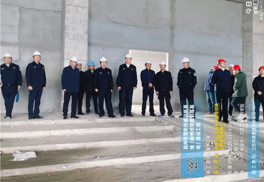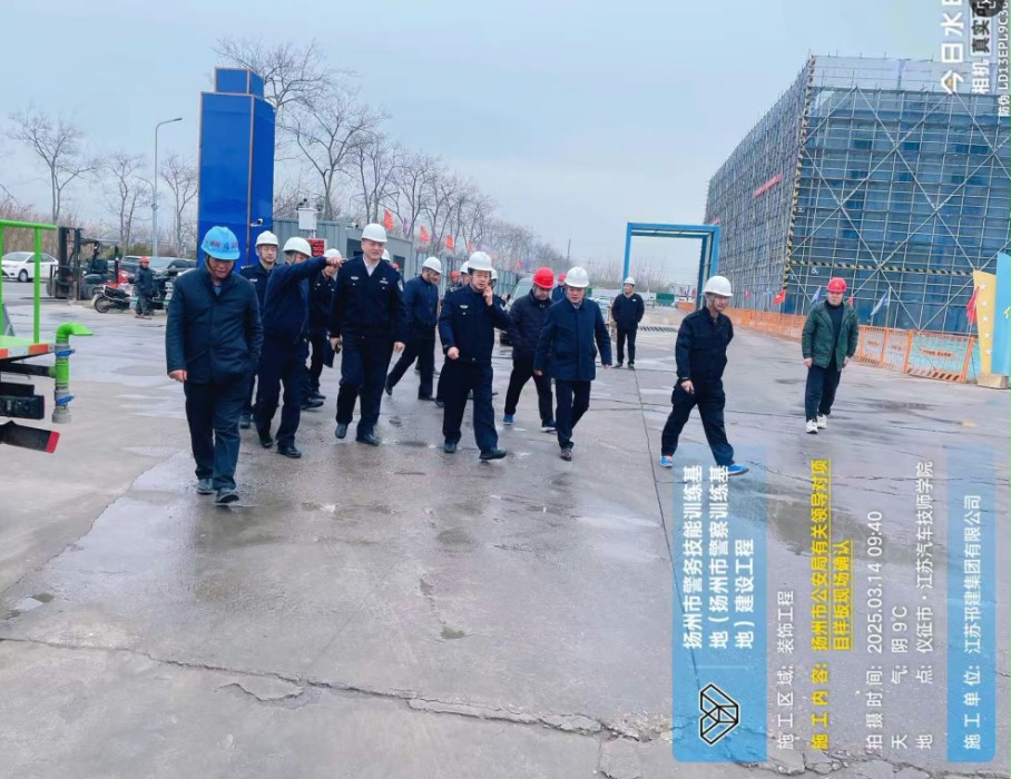 2025年3月14日上午,扬州市公安局杨林副局长及有关领导莅临我司警校项目现场指导,扬州华创、邗建集团、扬州设计院监理部有关人员全程陪同,现场分别查看了10#宿舍楼和1#教学楼内外样板,期间对各功能性用房实地考察工程进度、质量情况。现场结束后听取专题汇报并座谈交流。