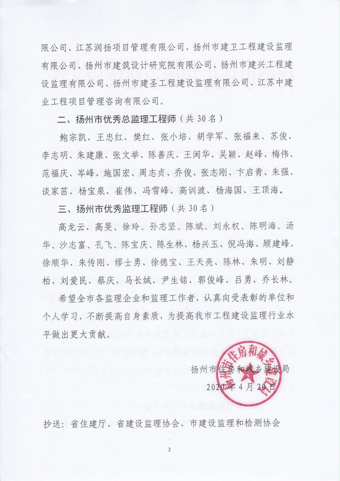 关于表彰2019年度扬州市“优秀监理企业”“优秀总监”和“优秀监理工程师”的通知