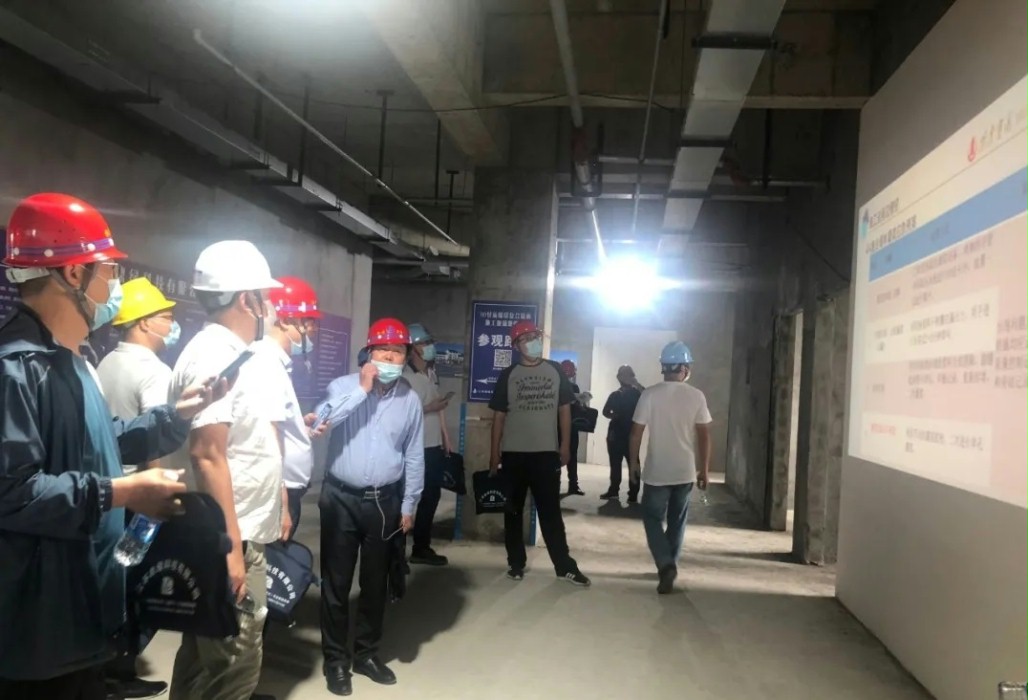 与会人员在项目部人员的引导和讲解下,仔细观摩了扬建集团扬州市公共卫生中心大楼项目的轻钢龙骨复合墙体工程,详细了解了各节点施工工艺和细部做法,并对新型墙体材料、标准化施工模式进行了交流学习。