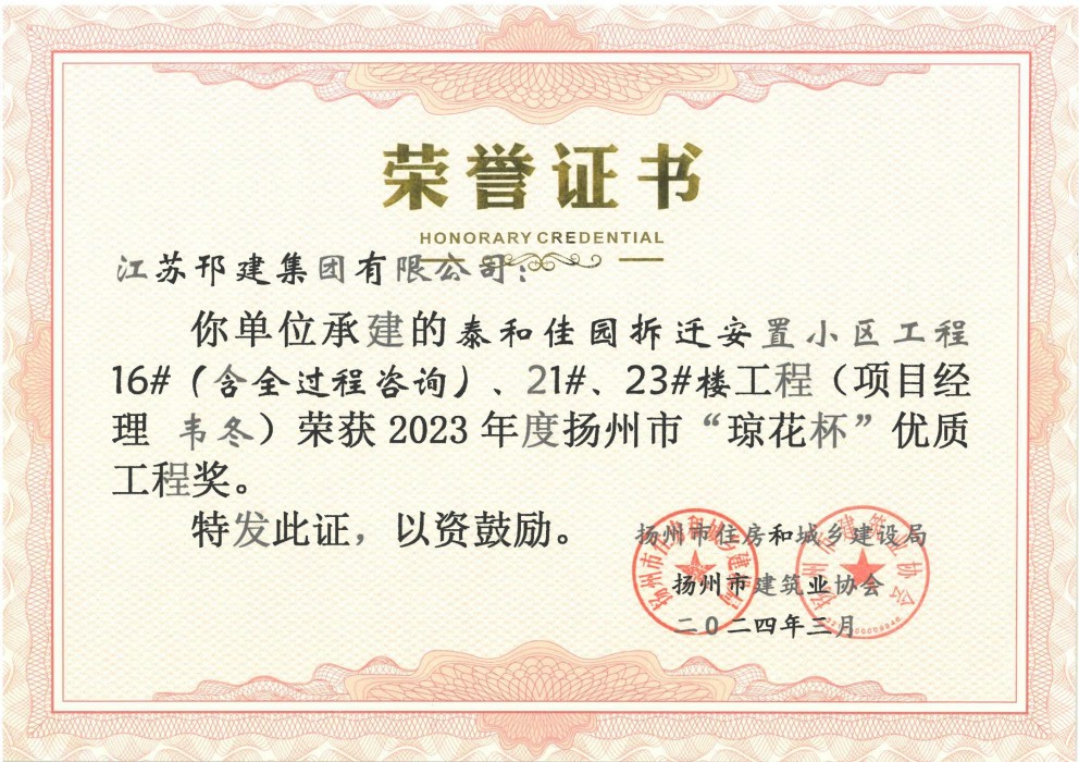 2024年3月,由我单位全过程咨询管理服务的泰和佳园拆迁安置小区荣获扬州市“琼花杯”优质工程奖。该项目全过程咨询服务包括设计、监理、勘察、测量及招标代理。项目总建筑面积约14.5万平方米,建有18层住宅小区、商业配套用房及附属设施。项目于2022年12月竣工交付,建设单位及物业单位对工程设计、功能使用、质量保修等服务较为满意。